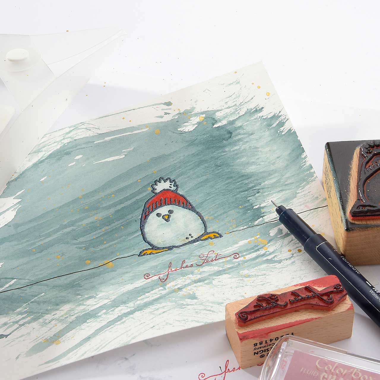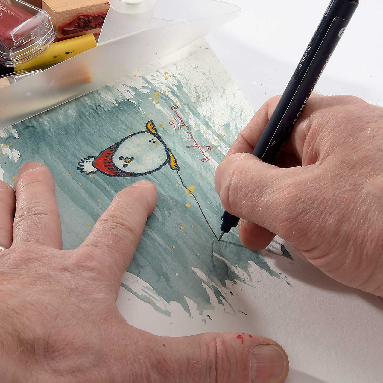 Ziehen Sie mit dem Tombow Fineliner eine dünne, waagerechte Linie an den Füßen des Winterküken Motivs.