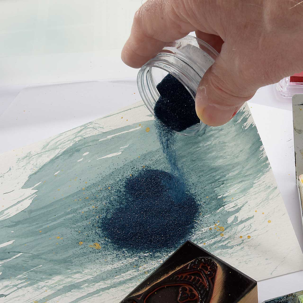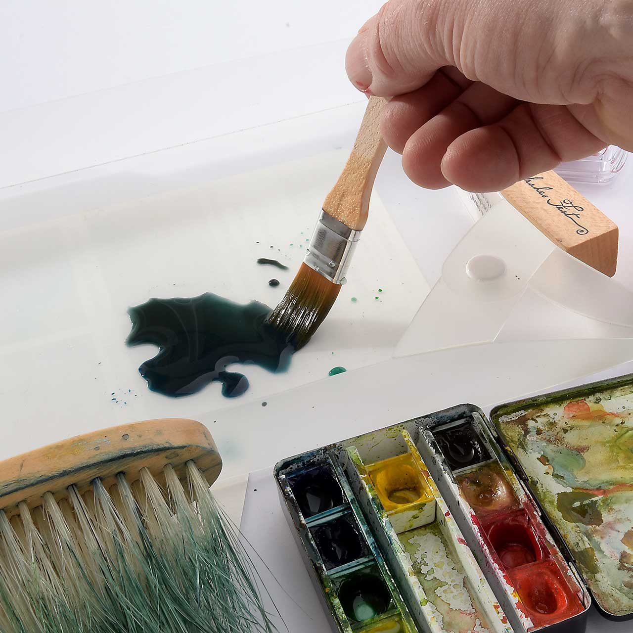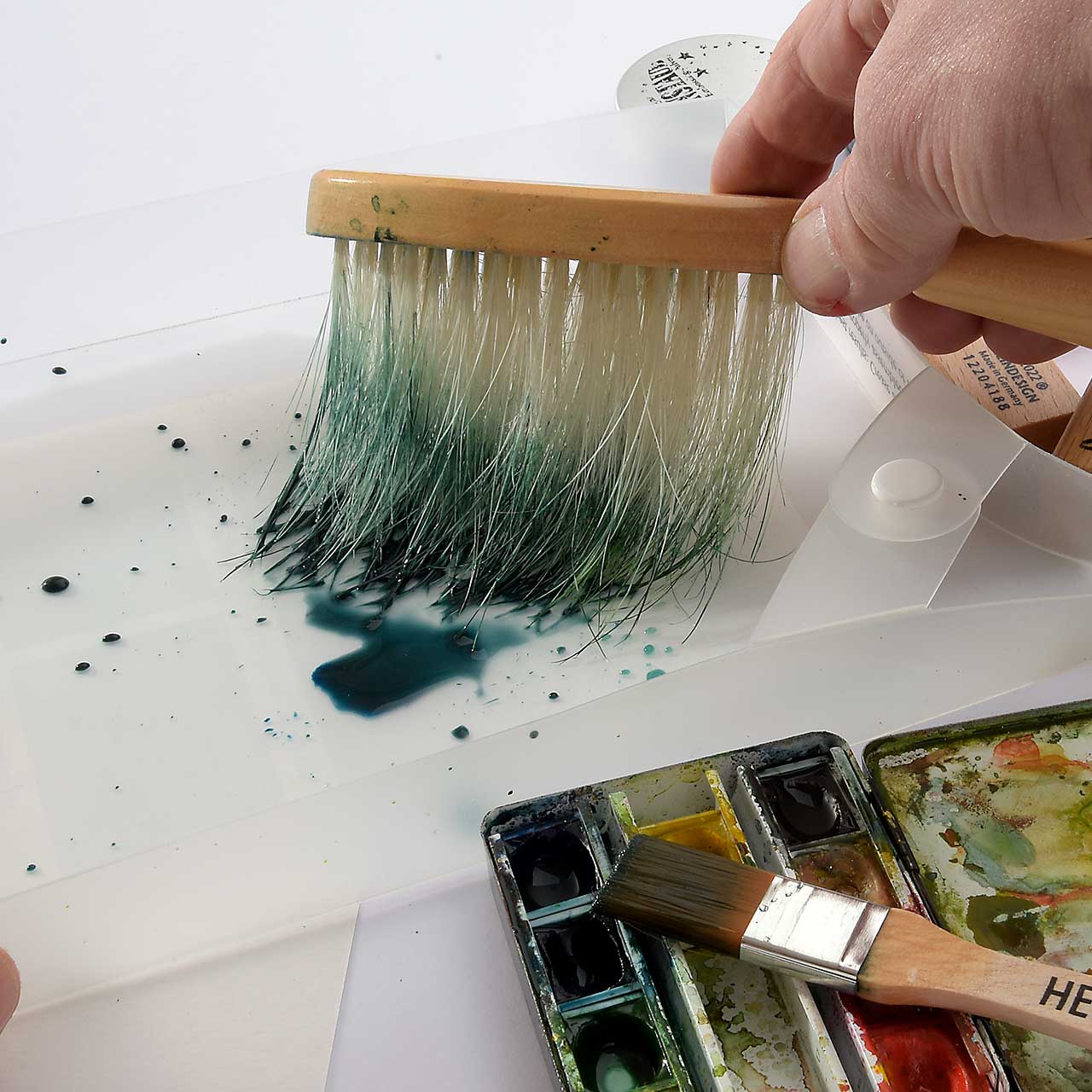 Nehmen Sie mit dem Flachpinsel blau-schwarze Farbe aus dem Aquarellkasten auf und drücken Sie den Pinsel in einem Snappy Tray aus. Es braucht relativ viel Farbe für den großen, breiten Feger, darum wiederholen Sie die Farbaufnahme mehrmals, bis einen größere Pfütze entsteht.