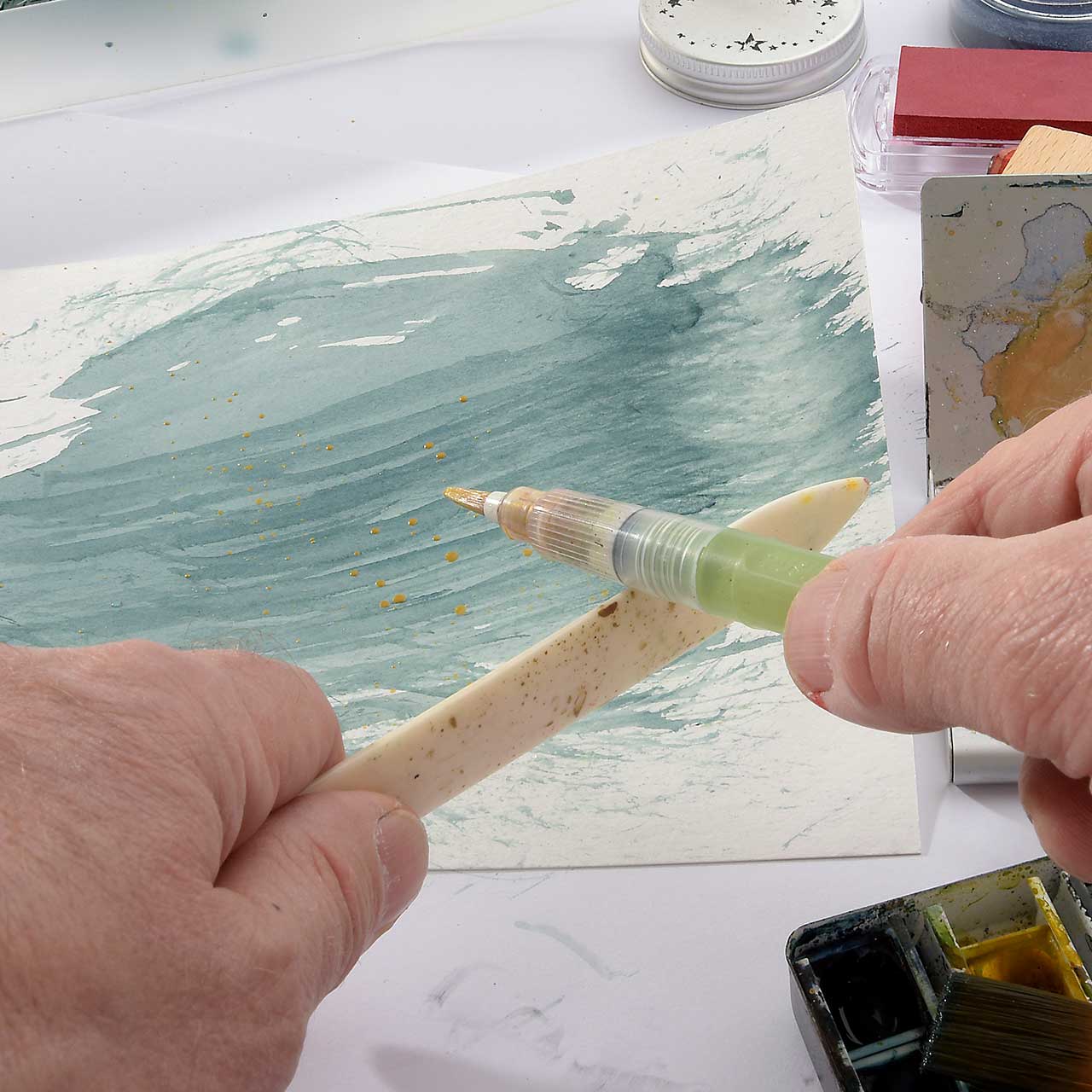 Nehmen Sie mit dem Füllerpinsel goldene Aquarellfarbe auf und klecksen Sie einige Sprenkel auf ihre Karte.