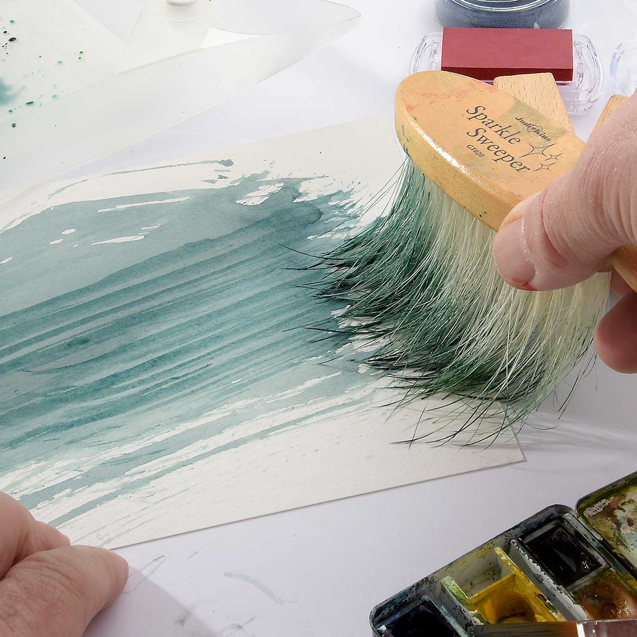 Nehmen Sie die blaue Farbe mit dem Flotten Feger auf und machen Sie einen breiten Strich über die ganze Seite der Karte. Lassen Sie die Farbe Trocknen und wiederholen Sie den Farbauftrag.