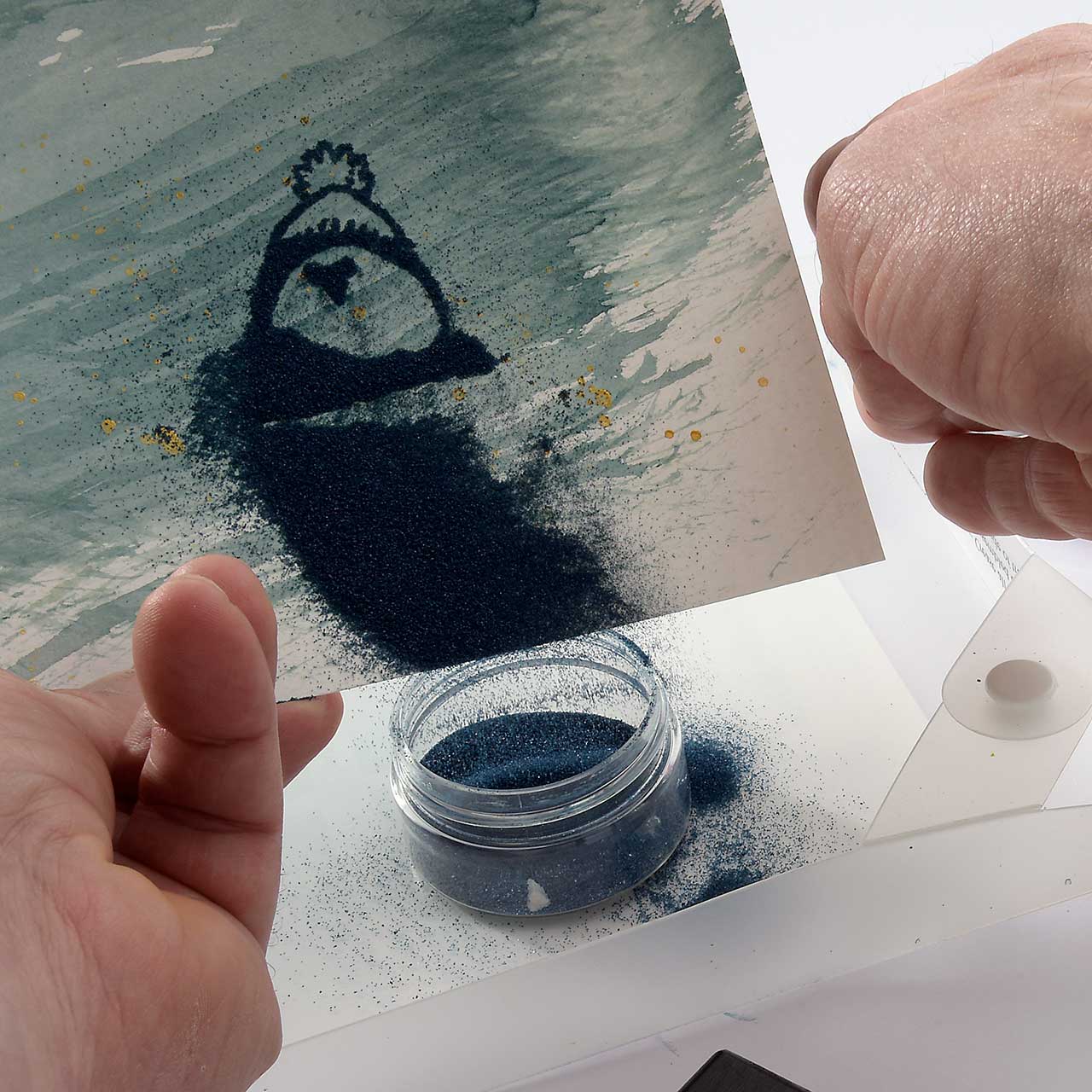 Stempeln und embossen Sie das Winterküken Motiv mit dem blauen Sternenstaub auf Ihre Karte.