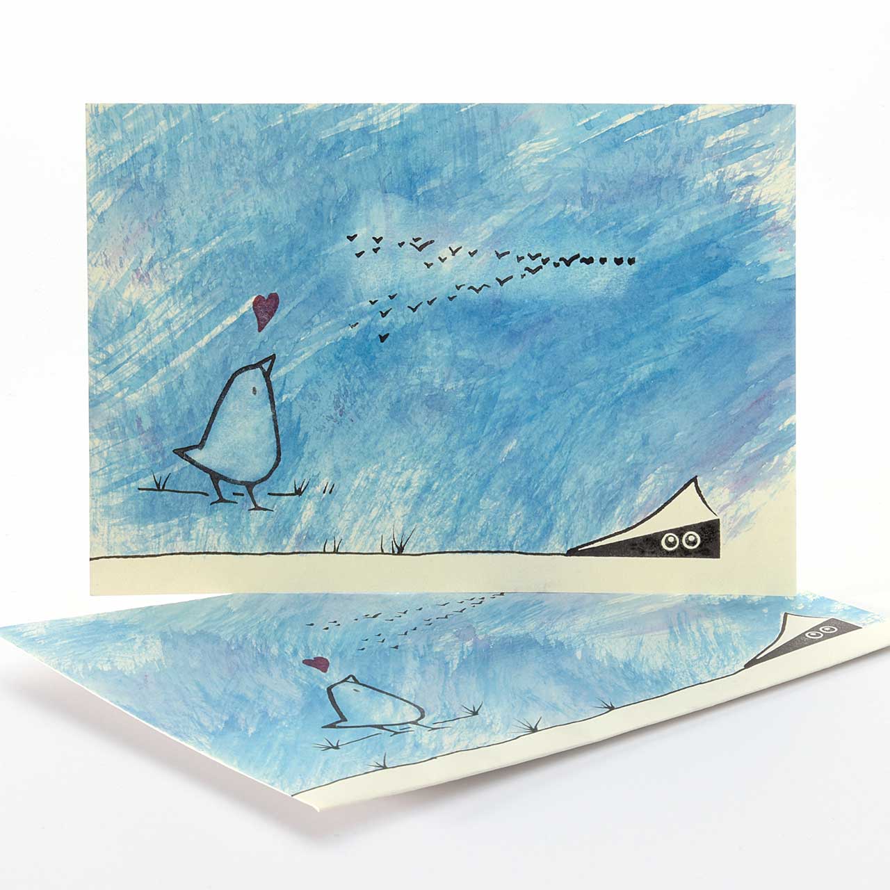 Stempeln Sie das Flugvögel Motiv rechts über das Vogel Motiv. (stempeln Sie vorsichtig, mit wenig Druck, die kleinen Vögel können leicht verschmieren).