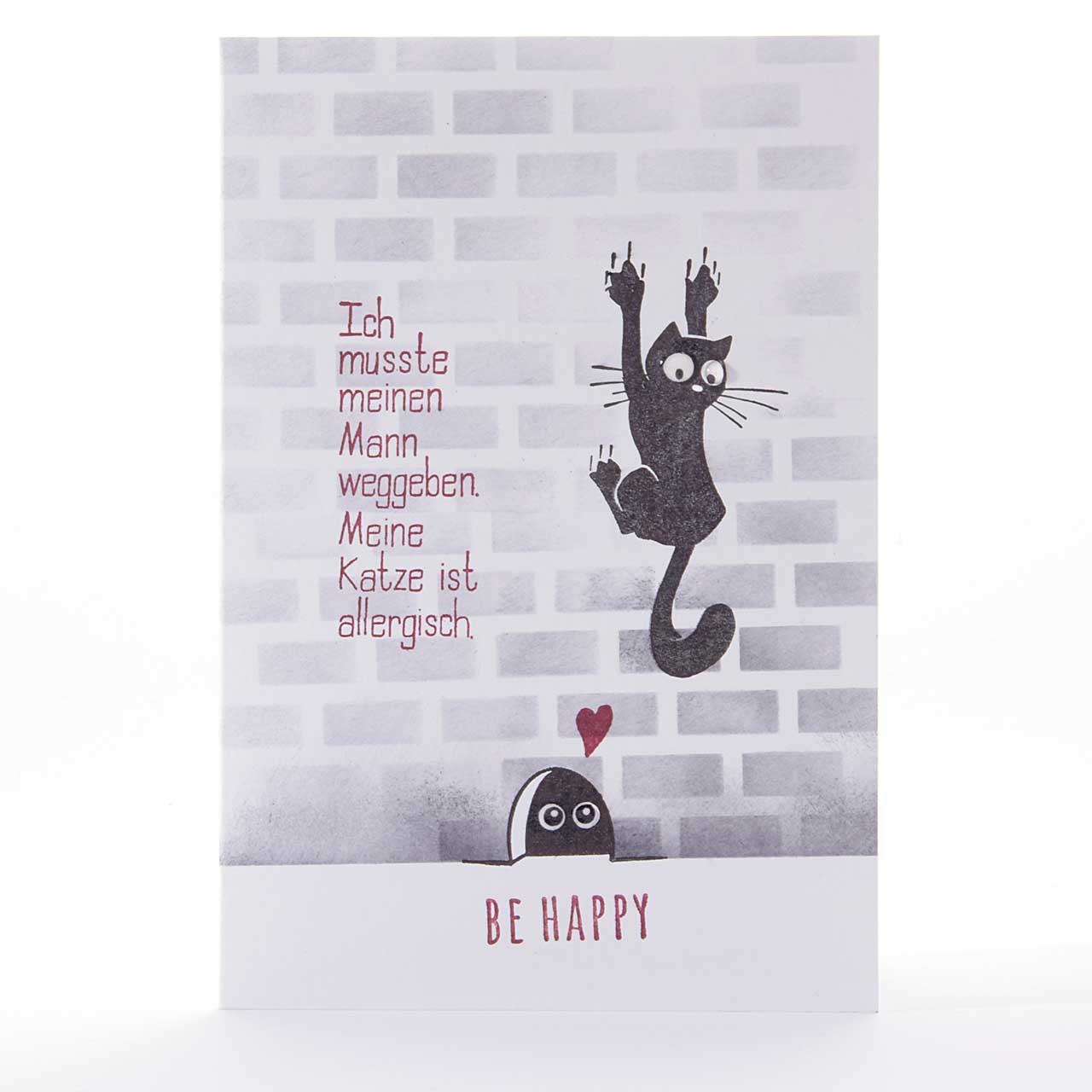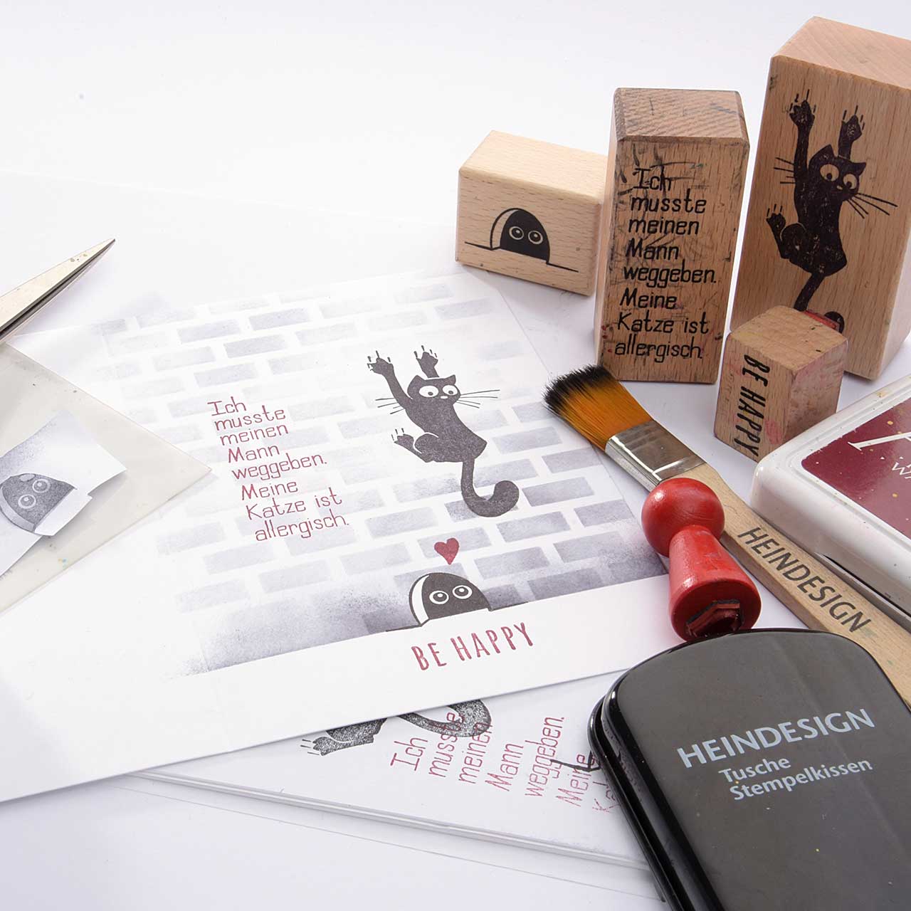 Stempeln Sie das „Ich musste meinen Mann weggeben ...“ Textmotiv mit dem roten Stempelkissen links neben das Rutschekatzen Motiv.