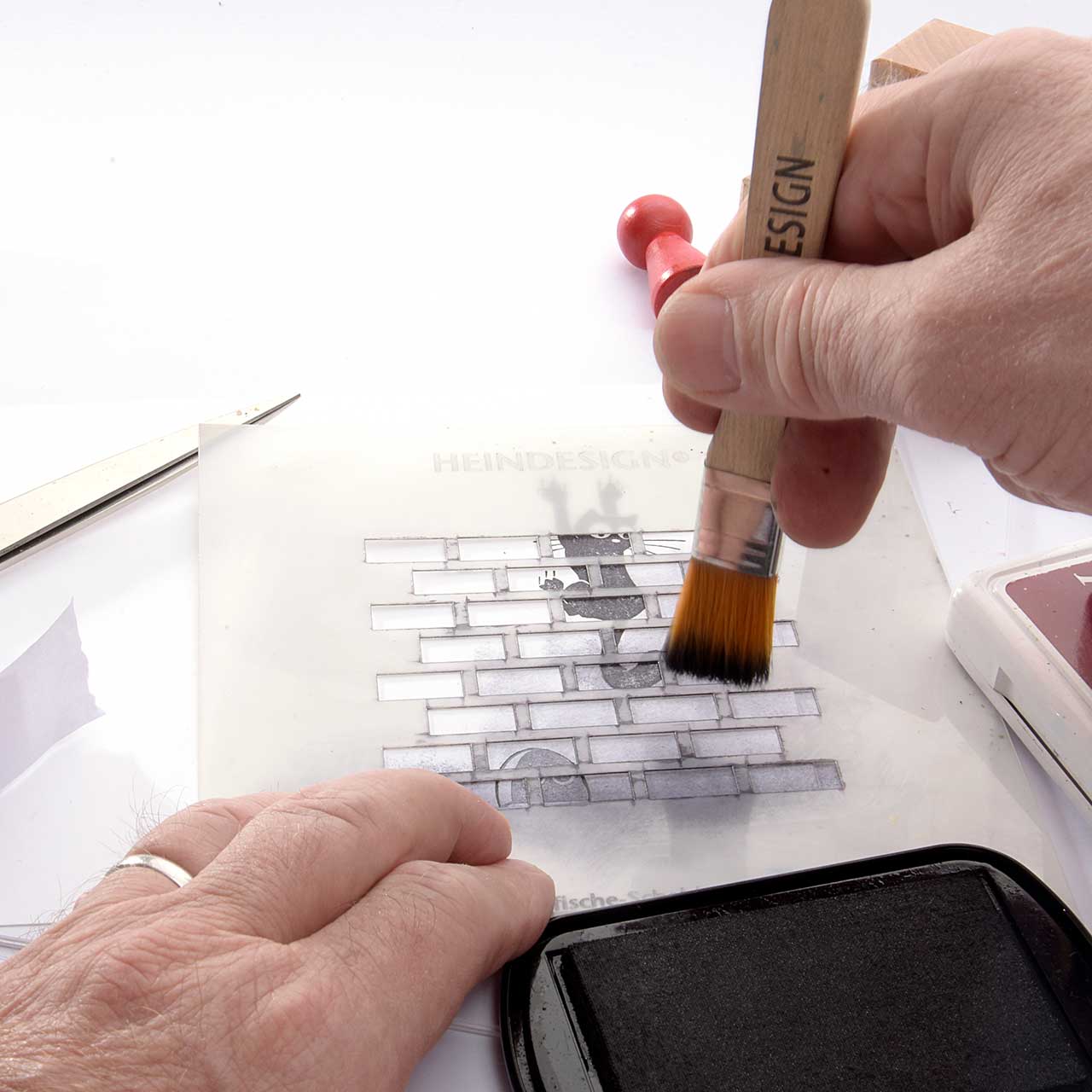 Legen Sie die Ziegelstein Schablone auf Ihre Karte und tupfen Sie das Motiv mit dem Pinsel auf ihre Karte. Um ihre Karte mit den Ziegelsteinen zu füllen, müssen Sie die Schablone mehrmals neu anlegen.