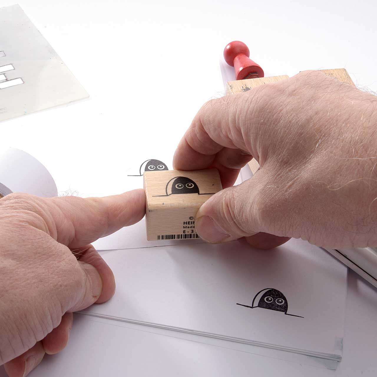 Stempeln Sie das kleine Herz Motiv mit dem roten Stempelkissen oberhalb des Mauseloch Motivs.