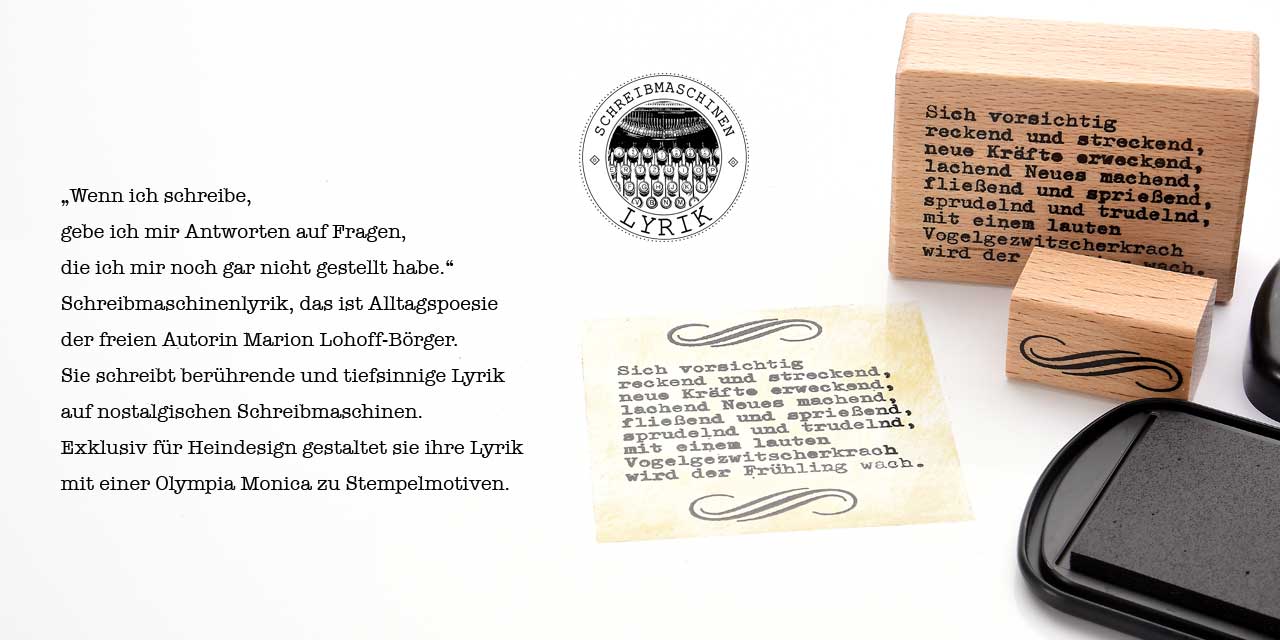 Ein auf einer alten Schreibmaschine getipptes Gedicht von Marion Lohoff-Börger. Stempel auf Handgriffgröße: 5 cm x 6 cm Gute Stempel, stempeln gut! Die Heindesign Stempel werden aus rotem Gummi produziert. Dieses Gummi - das aus natürlichem Kautschuk hergestellt wurde - garantiert einen feinen, detailreichen Abdruck und eine extrem lange Lebensdauer des Stempels. Das Stempelmotiv wird mit Hitze und Druck in das Gummi gepresst (vulkanisiert). Für eine gute Handhabung der Stempel wird das Stempelgummi mit einer dämpfenden Schicht auf einen Griff geklebt. Dieser Griff besteht aus einem lackierten Buchenholzklötzchen, das das Motiv in original Größe zeigt. Bei der Stempelmontage wird das Stempelgummi so ausgerichtet, dass das Gummi genau unter dem Abbild auf dem Klotz klebt. So können Sie immer gerade und passgenau stempeln. • Die Heindesign Stempel lassen sich mit Wasser reinigen, sollten aber schnell abgetrocknet werden. • Die Heindesign Stempel sind für Papier und für den Stoffdruck geeignet.