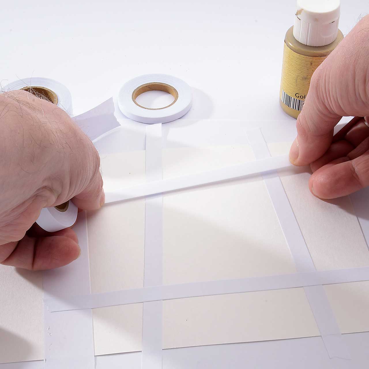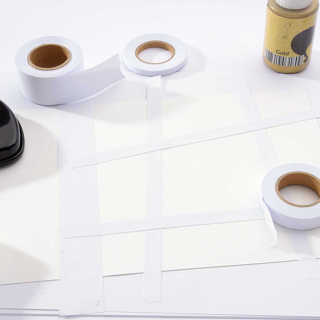 Unterteilen Sie ihre Karte mit vier mittelschmalen Eclipse Streifen in neun ungleichmäßige Flächen. (eine schräge Anordnung ist leichter und sieht spannender aus)