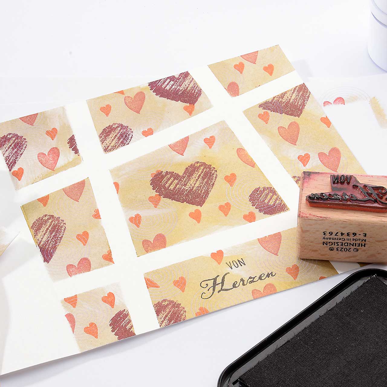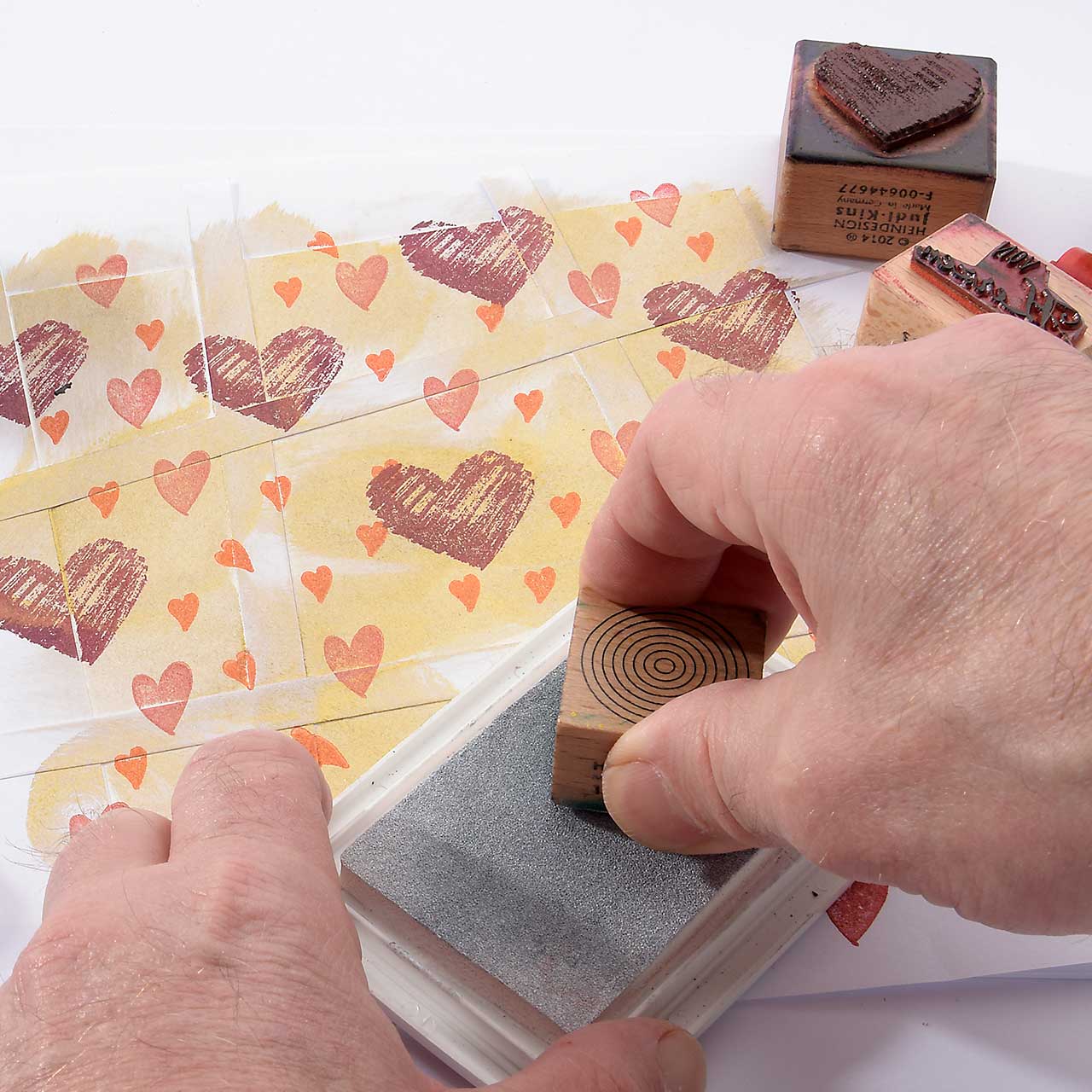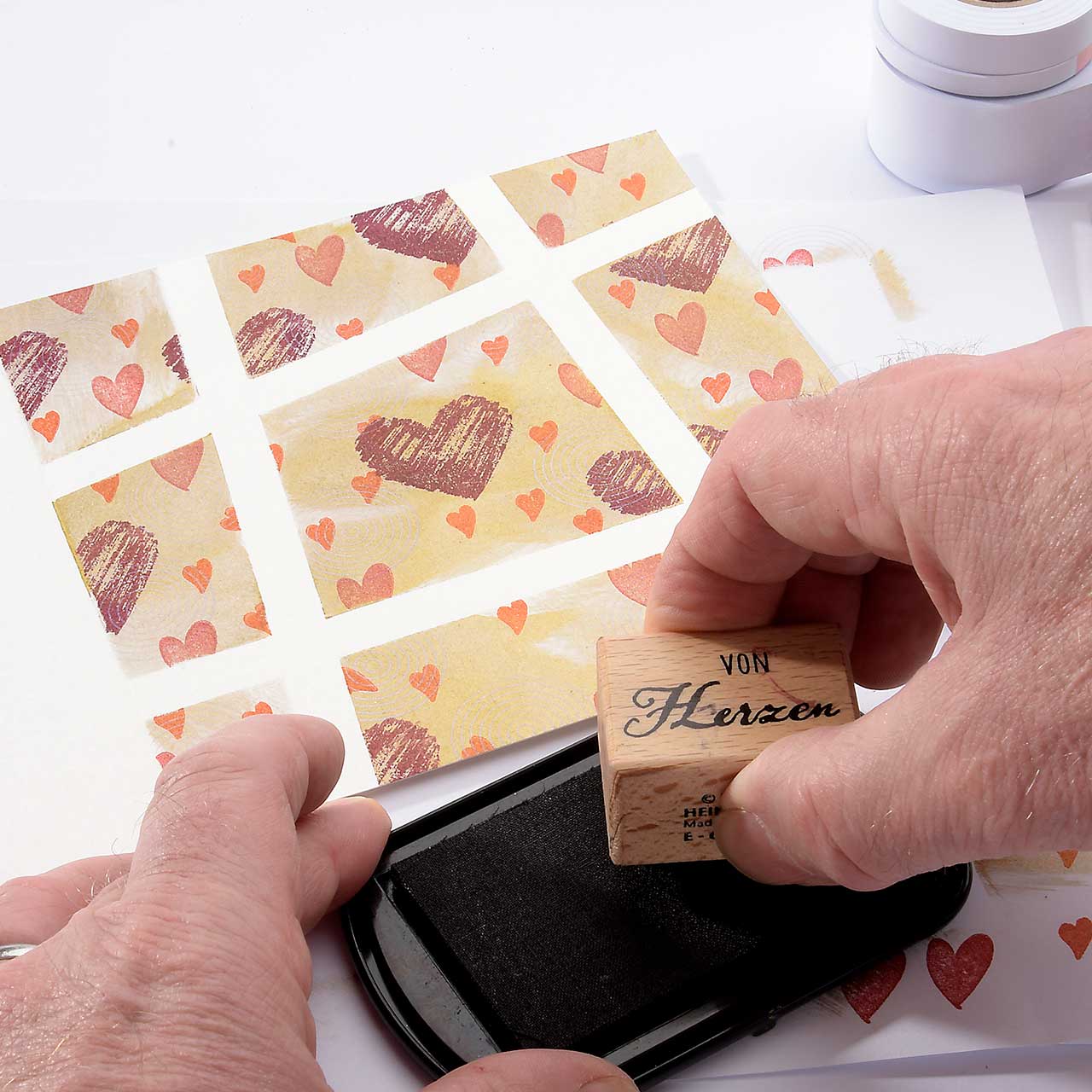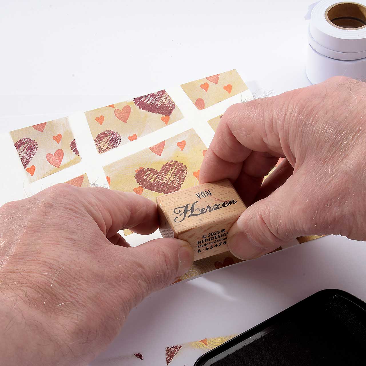 Stempeln Sie das mini Herz Motiv mit dem orangenen Mini-Stempelkissen mehrfach auf Ihre Karte. Für ein gleichmäßiges Druckbild färben Sie den Stempel vor jedem Abdruck erneut ein.