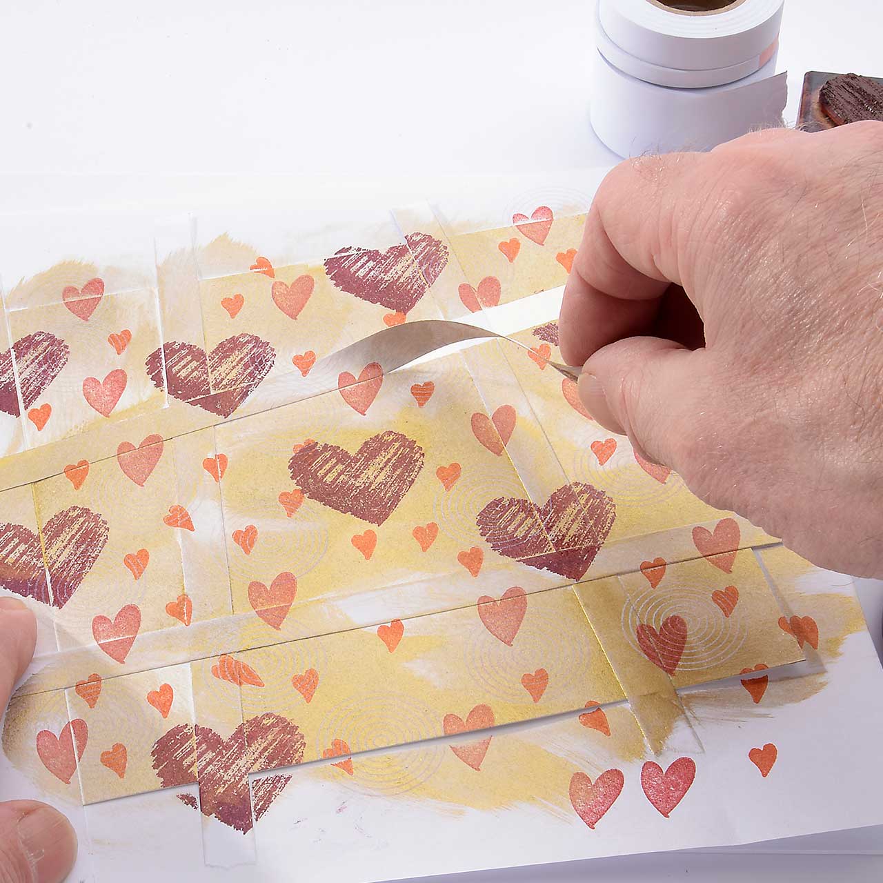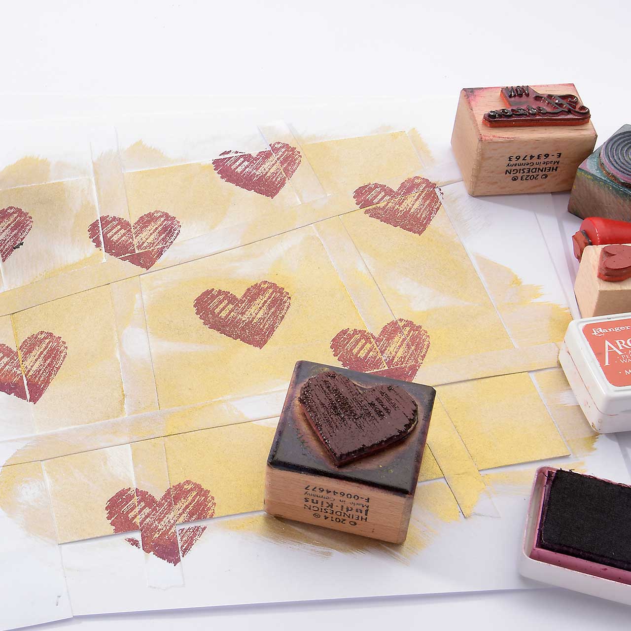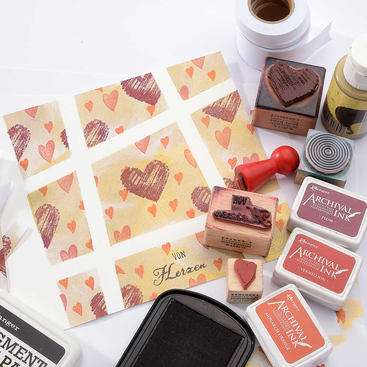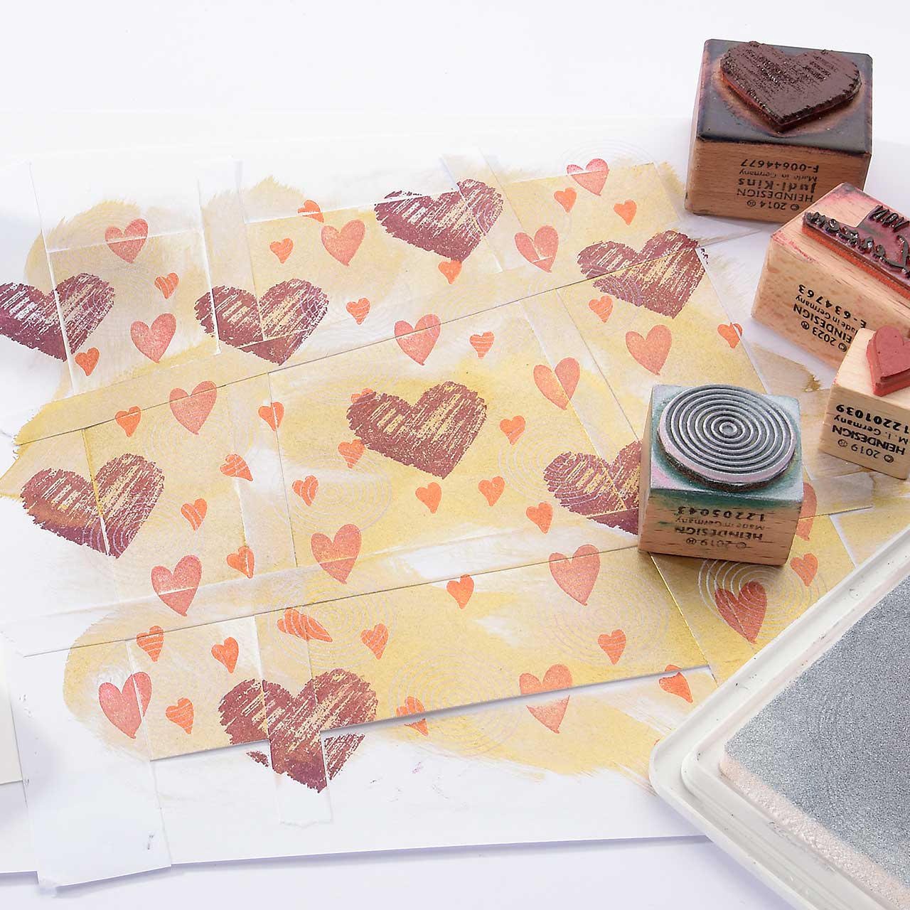 Stempeln Sie das mini Herz Motiv mit dem orangenen Mini-Stempelkissen mehrfach auf Ihre Karte. Für ein gleichmäßiges Druckbild färben Sie den Stempel vor jedem Abdruck erneut ein.