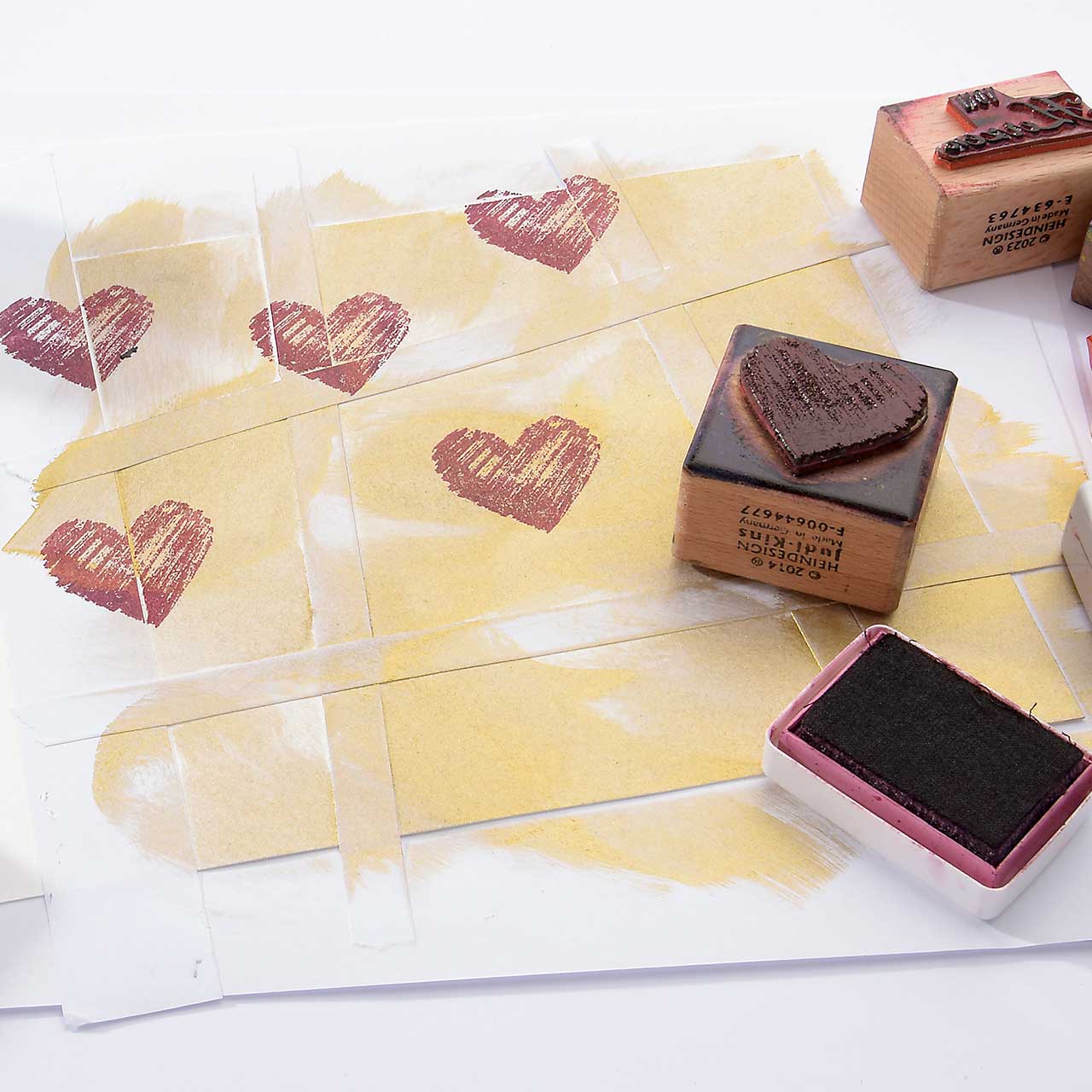 Stempeln Sie das schraffierte Herz Motiv mit dem dunkelroten Mini-Stempelkissen mehrfach auf Ihre Karte. Für ein gleichmäßiges Druckbild färben Sie den Stempel vor jedem Abdruck erneut ein.