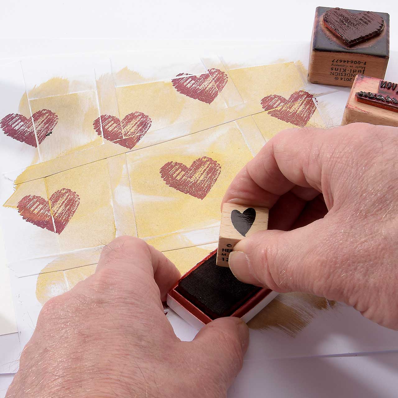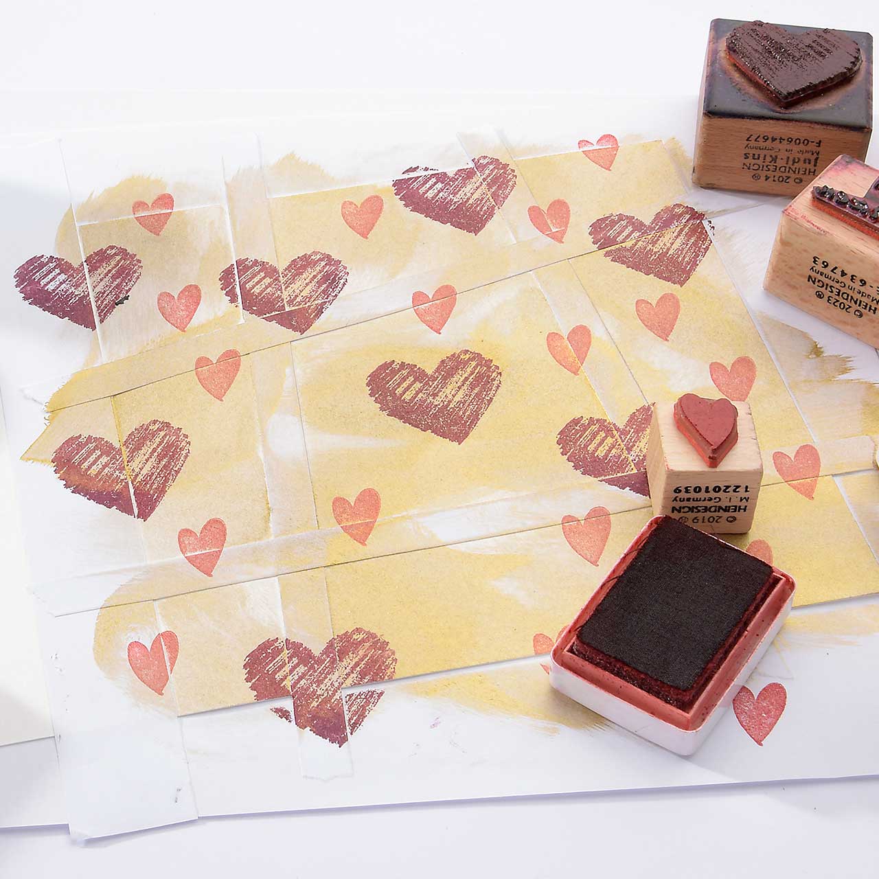 Stempeln Sie das kleine Herzflächen Motiv mit dem roten Mini-Stempelkissen mehrfach auf Ihre Karte. Für ein gleichmäßiges Druckbild färben Sie den Stempel vor jedem Abdruck erneut ein.