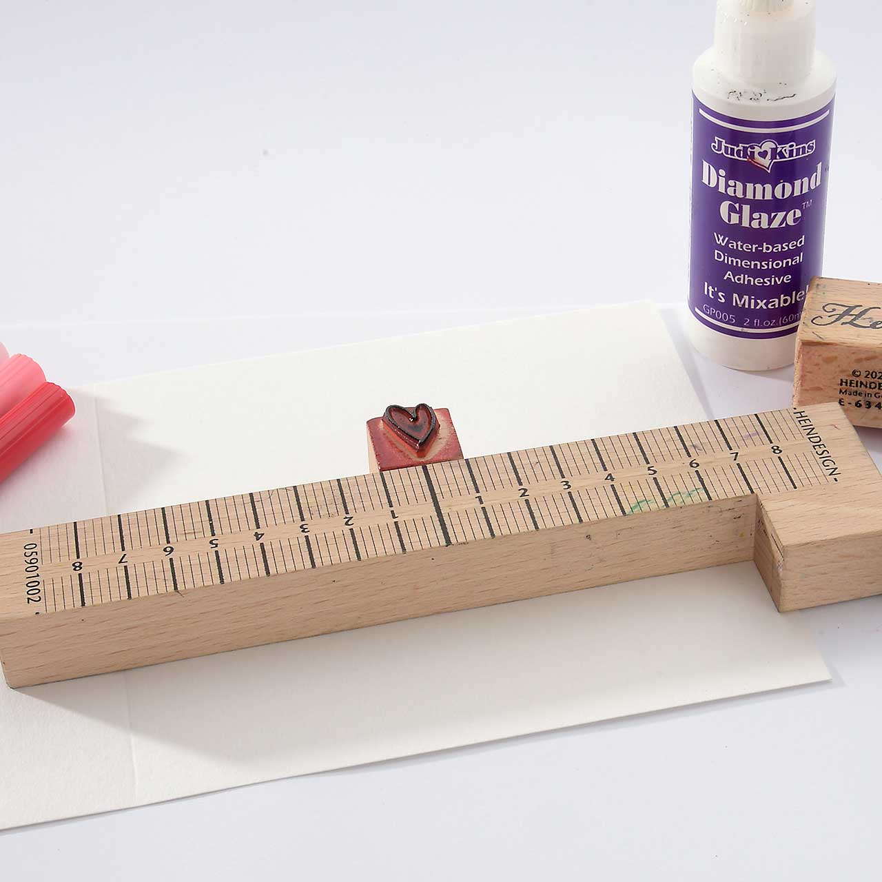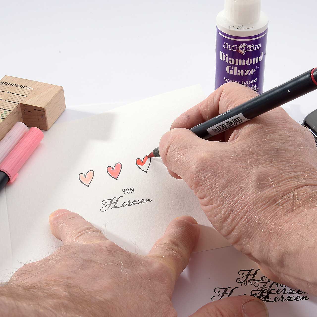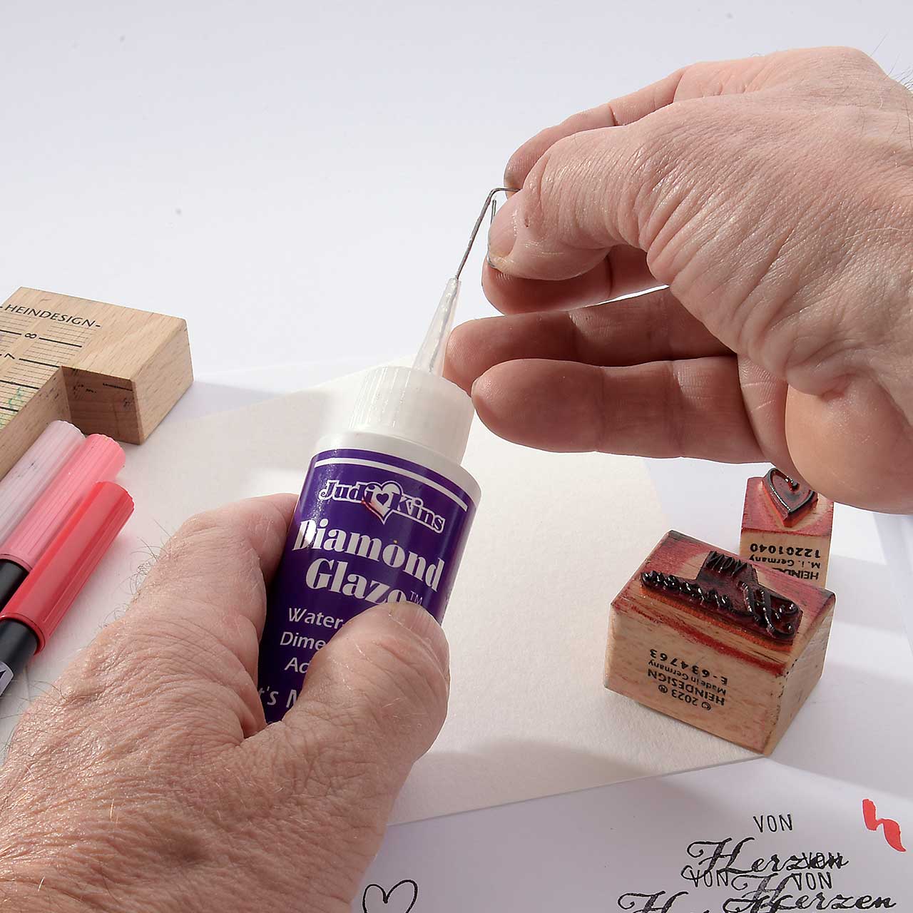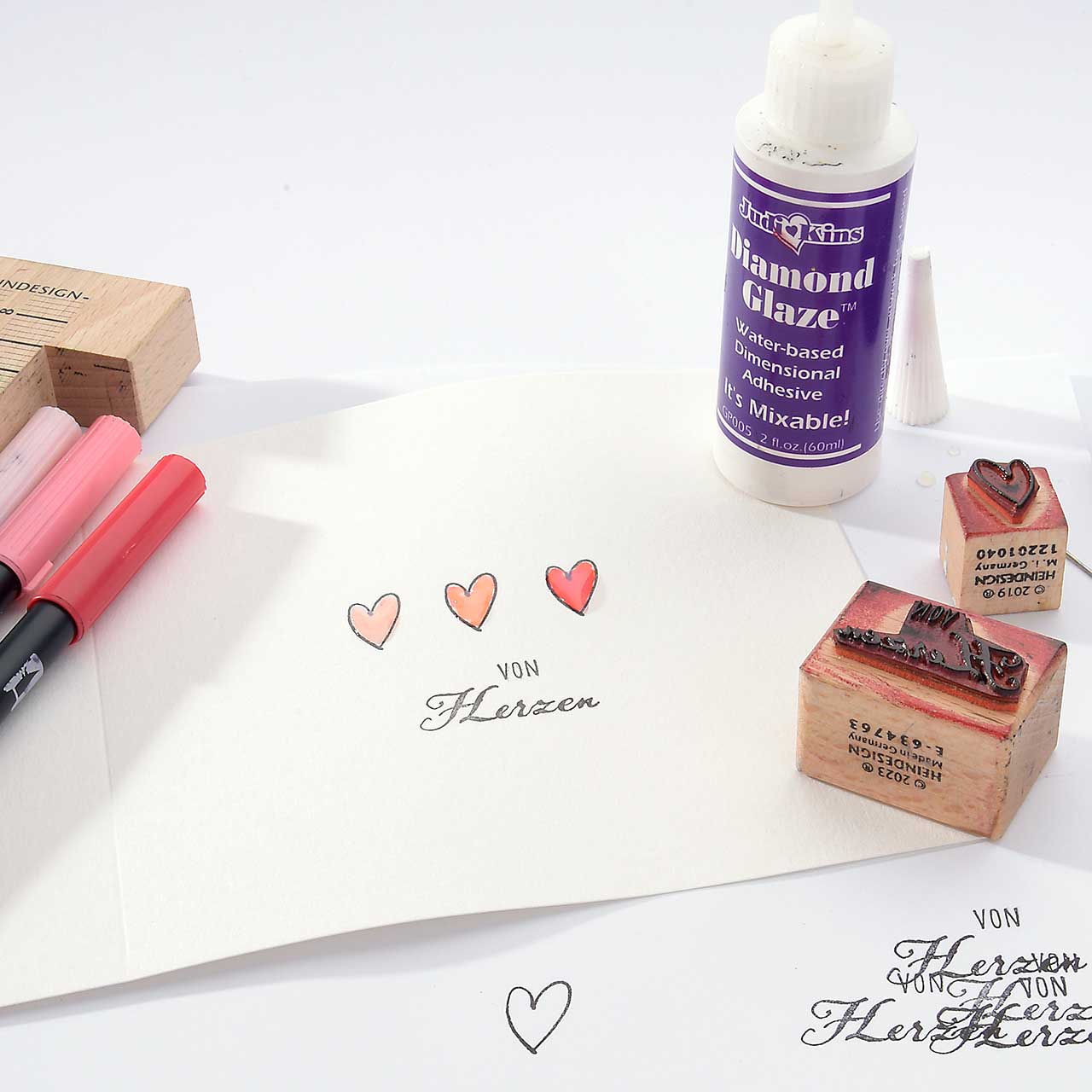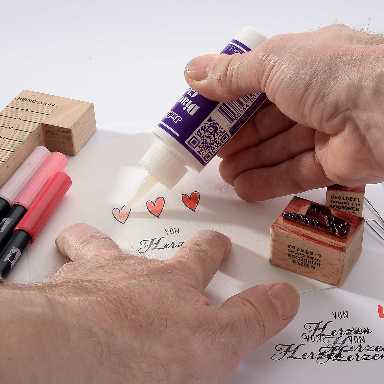 Geben Sie eine dicke Schicht Diamond Glaze auf jedes Herz. Malen Sie mit der Spitze des Diamond Glaze Fläschchen die Herzform nach. Lassen Sie das Diamond Glaze gut zwei Stunden trocknen.