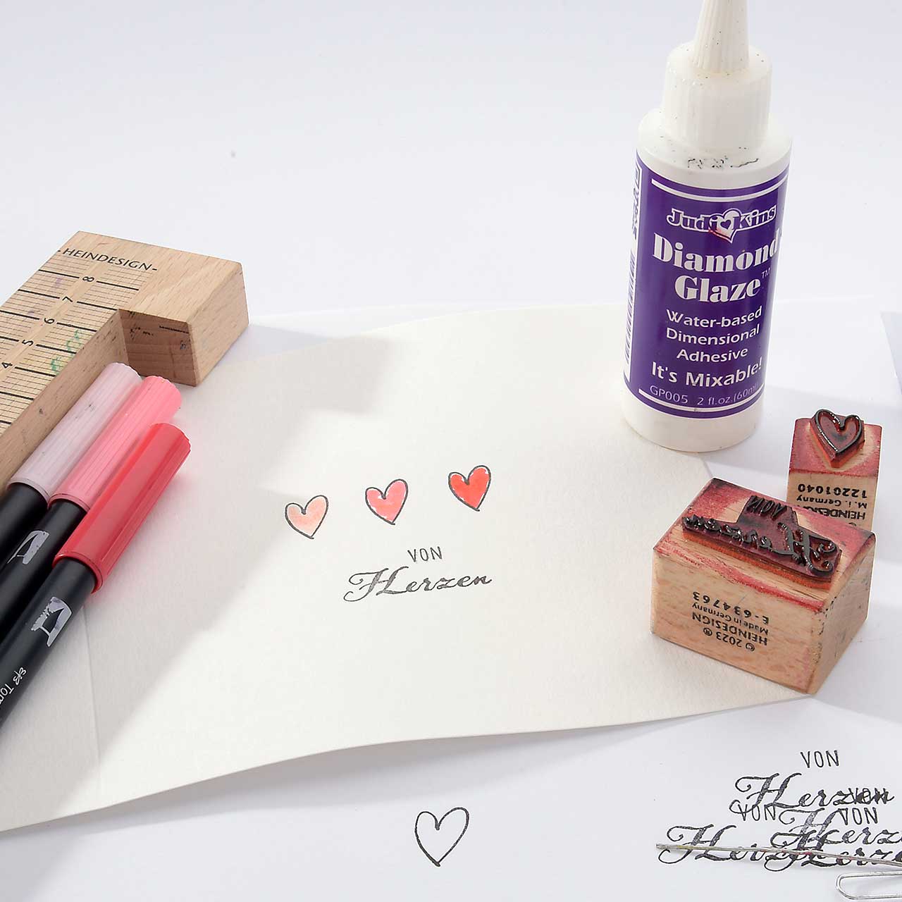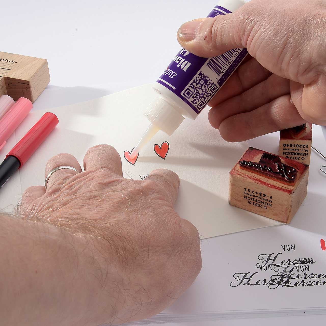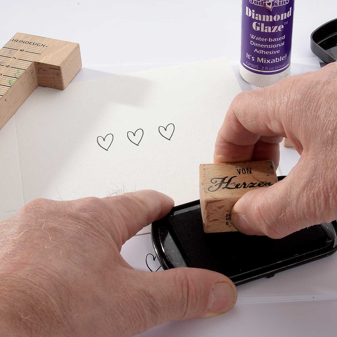 Stempeln Sie das „von Herzen“ Textmotiv mit dem schwarzen Stempelkissen unter die Herzen.