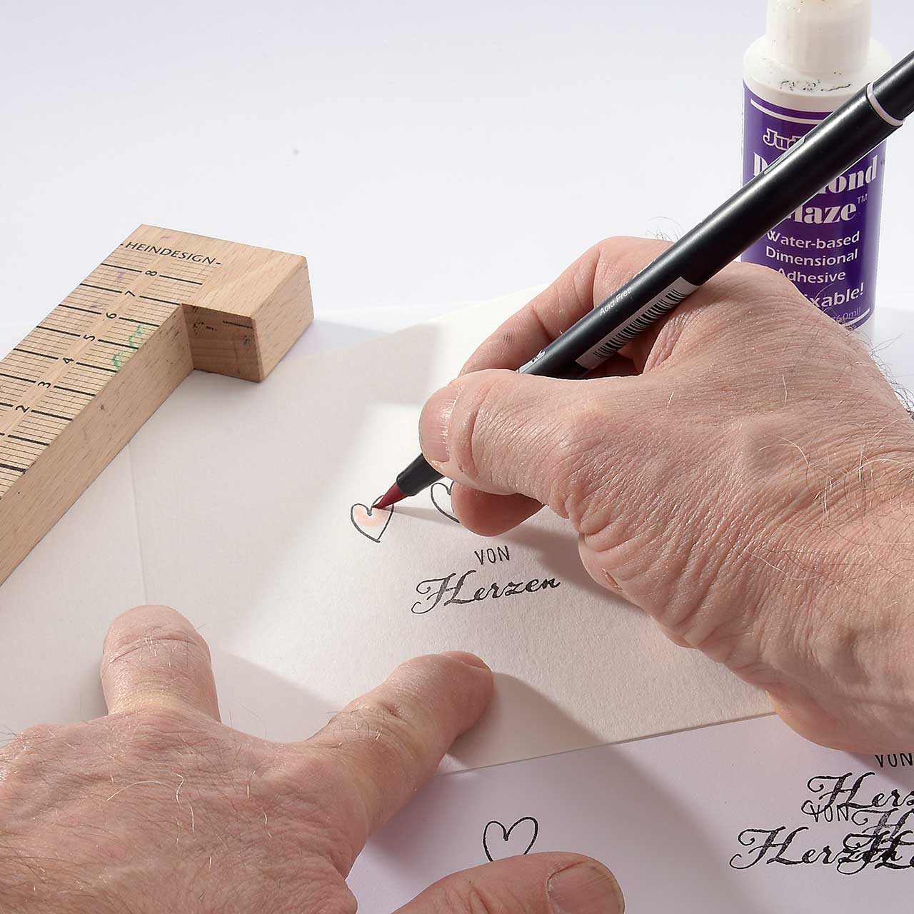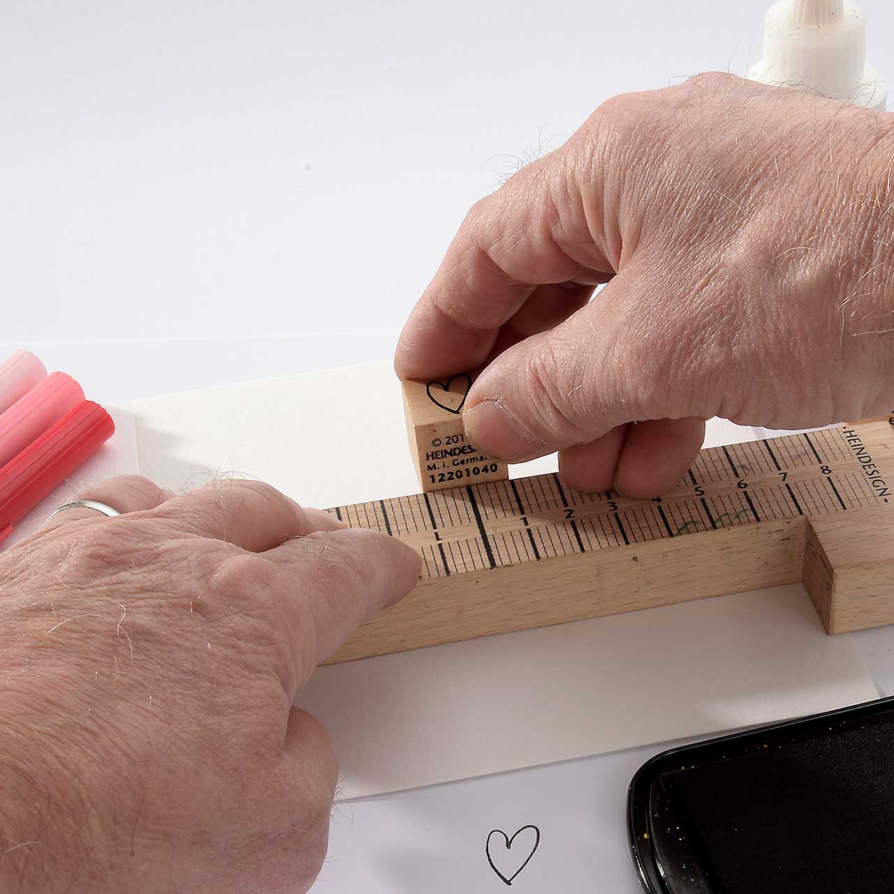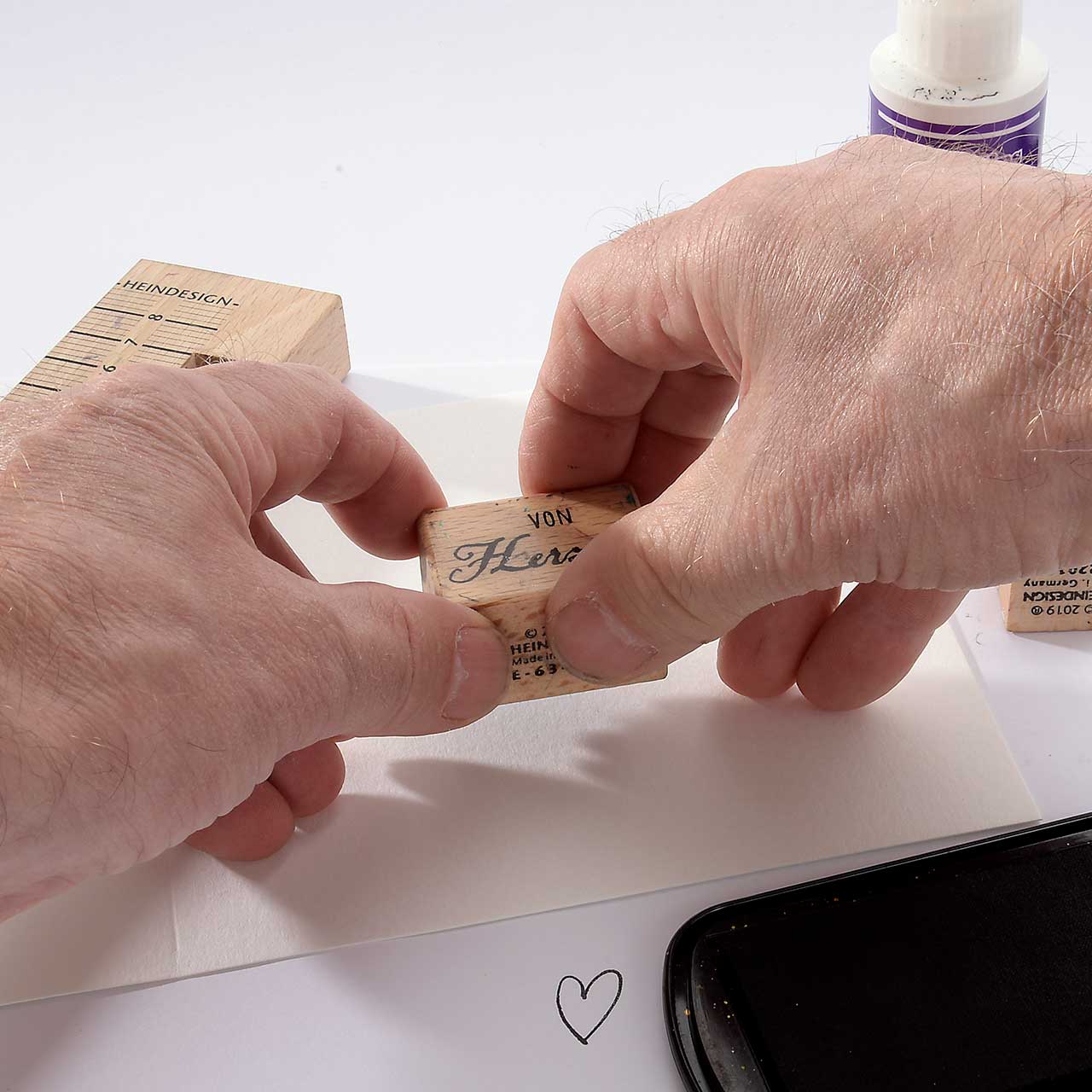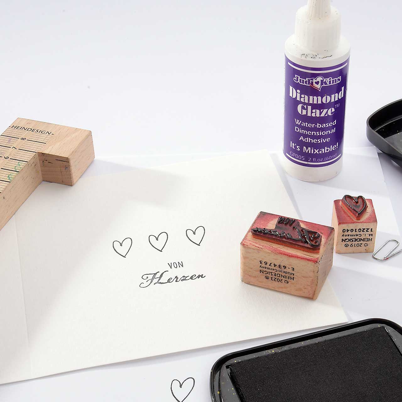 Stempeln Sie das „von Herzen“ Textmotiv mit dem schwarzen Stempelkissen unter die Herzen.