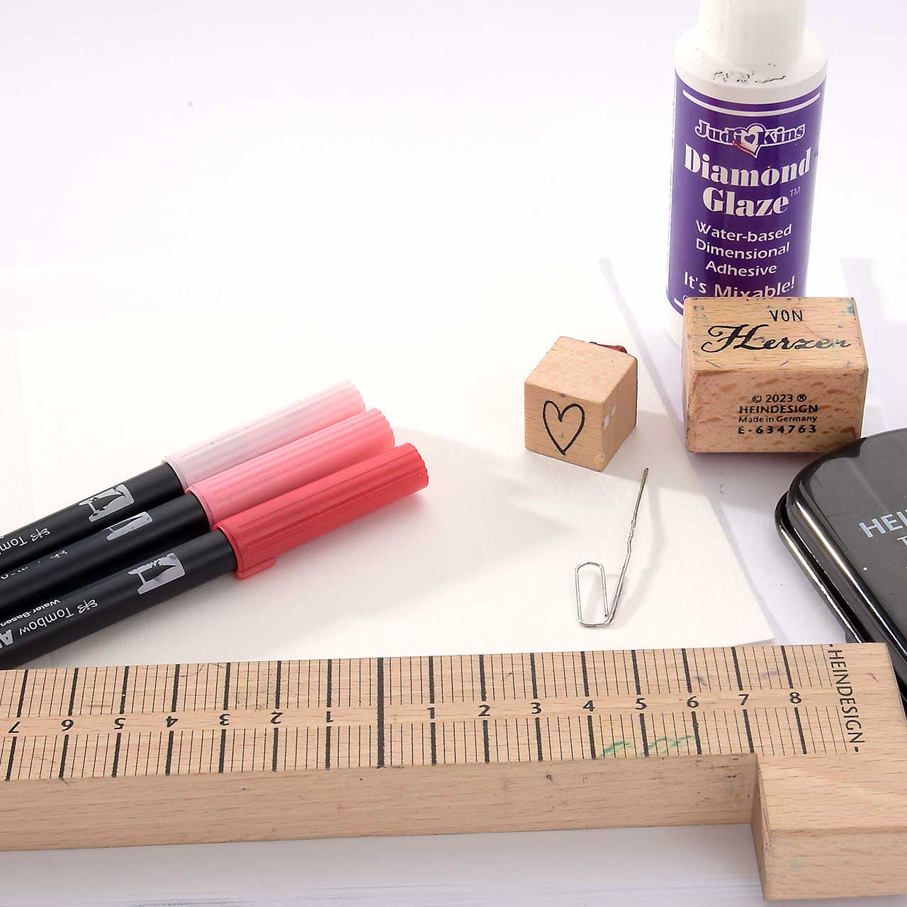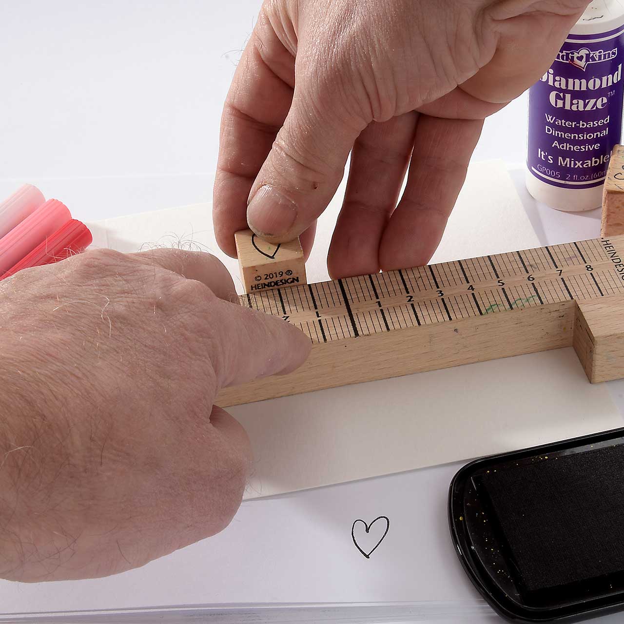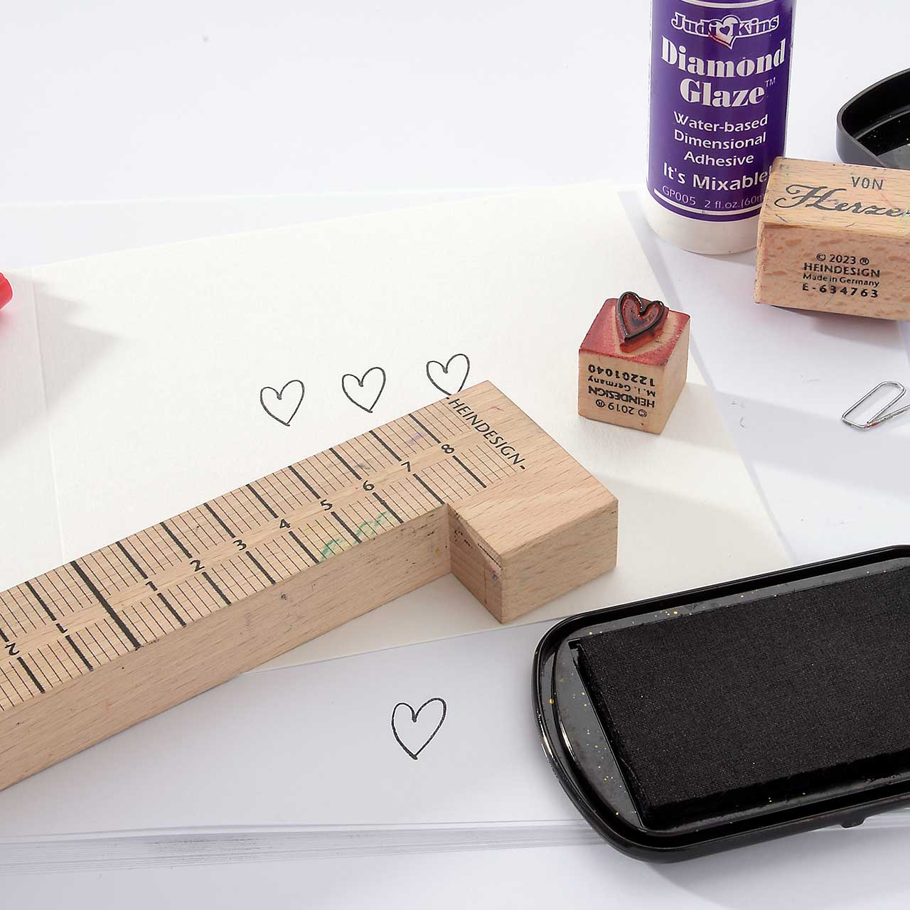 Stempeln Sie das kleine Herz Motiv drei Mal mit dem schwarzen Stempelkissen in einer Reihe am Stempel-Anlegewinkel entlang auf ihre Karte.  Für ein gleichmäßiges Druckbild färben Sie den Stempel vor jedem Abdruck erneut ein.