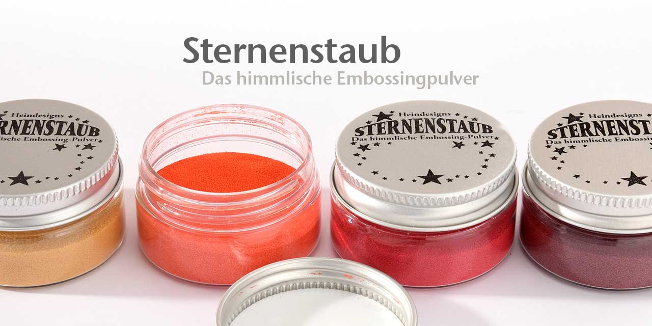 Diese warme, dunkelgrüne Farbe eignet sich sehr gut als Kontur für Motive die mit Aquarelltechnik koloriert werden sollen. Wie die Märchen-, Blumen- oder Tiermotive. Die Farbe ist halbtransparent. Das heißt, die Farbe mit der Sie stempeln bzw. die des Untergrundes scheint durch. Embossing Pulver - 14ml - ca. 11g Sternenstaub ist ein feines Kunstharzpulver, das Stempelabdrucken einen lackartigen Reliefcharakter verleiht. Dieser Effekt macht das Embossing zur zentralen Stempel-Technik. Mit Embossing können Sie Stempel-Motive haltbar auf die unterschiedlichsten Materialien auftragen. Neben Papier und Karton, können Sie auch Metall, Holz, Textilien und Kunststoff mit Sternenstaub verzieren. Dabei müssen Sie nur darauf achten, dass Ihr Material auch die Hitze des Embossing Prozesses verträgt. Damit es gelingt müssen Sie nur wenig beachten: Der Untergrund muß trocken sein. Der Stempelabdruck muß feucht sein. Das Sternenstaub muß richtig heiß gemacht werden, über 110° Grad. (Es geht nicht mit einem Haarfön, der wird nicht heiß genug!) Neben dem Heißluftgerät eignen sich Toaster, Bügeleisen oder eine Herdplatte für das Erhitzen.